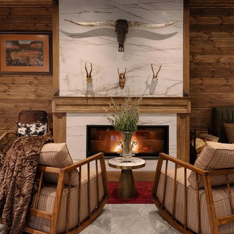 ركز تصميمك حول الموقد. إن إطار الموقد المصنوع من الحجر الطبيعي، سواء كان من الجرانيت الخشن أو الرخام الأنيق، يصبح على الفور القطعة المركزية الدافئة والجذابة في غرفة المعيشة الخاصة بك.