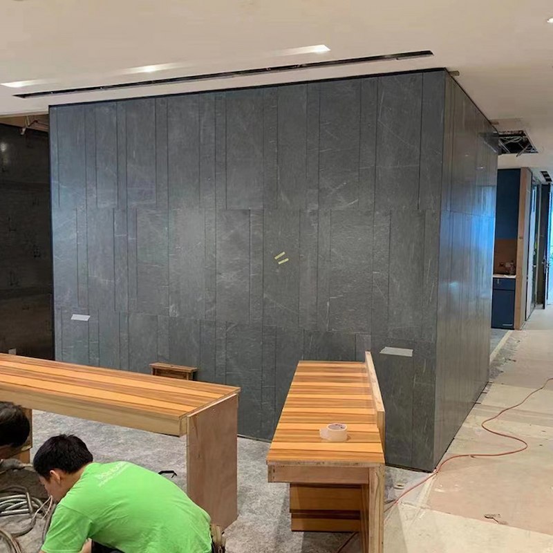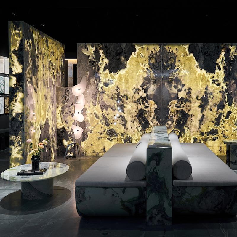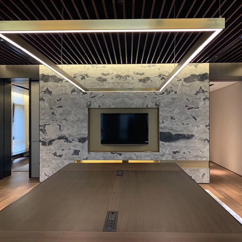 عند إضاءة الأنوار، تخترق أشعتها الحجر وتنتشر بنعومة، مُبرزةً بشكلٍ لافتٍ ألوانه الدافئة وعروقه الطبيعية. يمكنك تعديل لون الإضاءة (غالباً ما يكون أبيض دافئاً لإضفاء جوٍّ مريح) وسطوعها لتناسب مختلف المشاهد والأجواء. لا يُمثّل هذا التصميم قمة الفخامة فحسب، بل يضفي على المكان أيضاً لمسةً مستقبليةً وأجواءً تُشبه صالات العرض الفنية، ليصبح بذلك روح الغرفة بلا منازع.