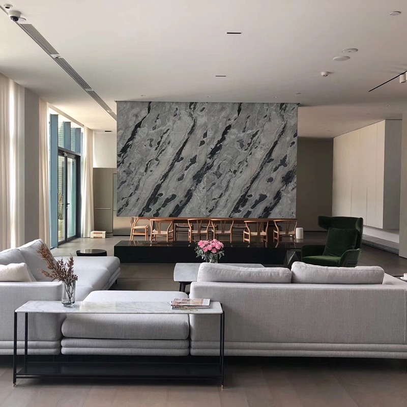 A:يجسد هذا الكوارتزيت الأزرق الرمادي أجواء البحر الهائج، ويتميز بعروق أنيقة ومتدفقة لإضفاء لمسة عصرية فاخرة.